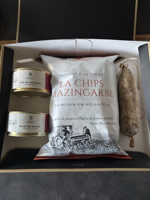 Dans cette box vous retrouverez, un pâté de campagne (190g), une rillettes de porc (190g), notre saucisson de porc vice champion de France 2023, un paquet de nos chips locales nature.